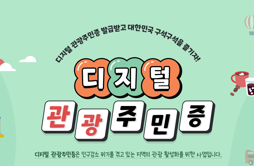 - '대한민국 구석구석' 에서 디지털 관광주민증을 미리 발급 받으시면 추후 이용하기에 편리합니다.