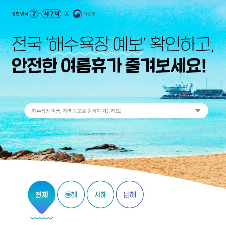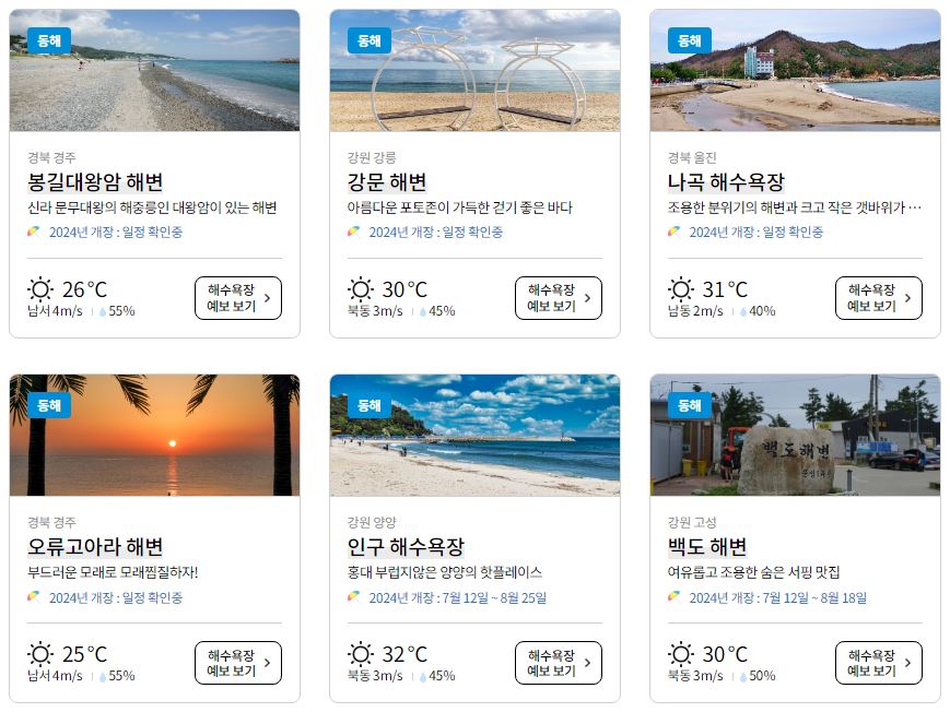 - '대한민국 구석구석'을 통해 동해 해수욕장 검색 시 상단의 일부분이며, 일정 확인 중인 곳과 일정이 확정된 곳이 있으니, 방문하실 곳을 확인해 주시기 바랍니다.